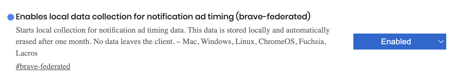 Type brave://flags in the URL bar and search for #brave-federated. Change this setting from Default to Enabled, as seen below, to start the local data collection process.