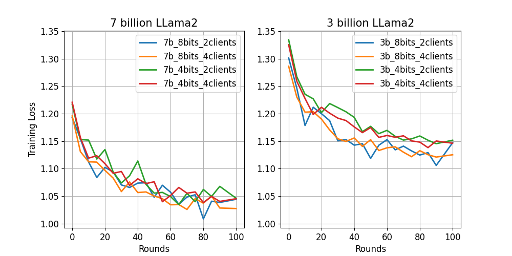 Here we show the result from fine-tuning LLMs under this example. The above figure shows the training loss change over FL rounds for 8 settings. As expected, LLama2-7B model works better than its 3B version with lower training loss. With the hyperparameters tested, the 8-bit model seems to deliver lower training loss for the smaller 3B model compared to its 4-bit version.