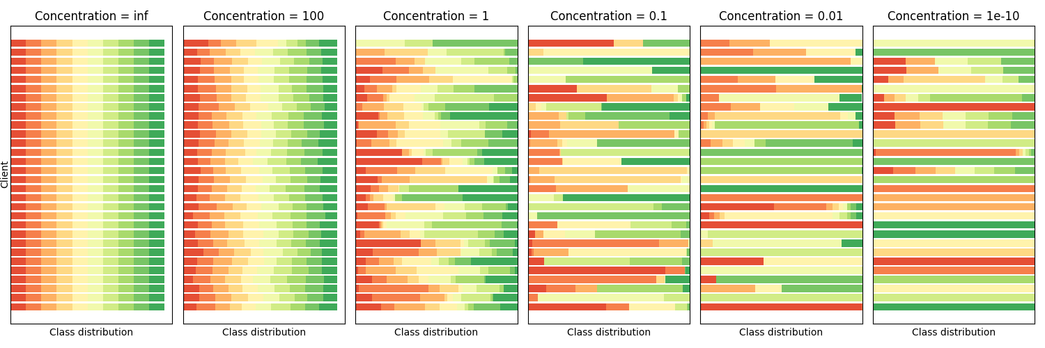 Data distribution: The following figure illustrates the use of multiple concentration values to generate the data distribution over 30 clients for CIFAR-10 (10 classes) - source code: