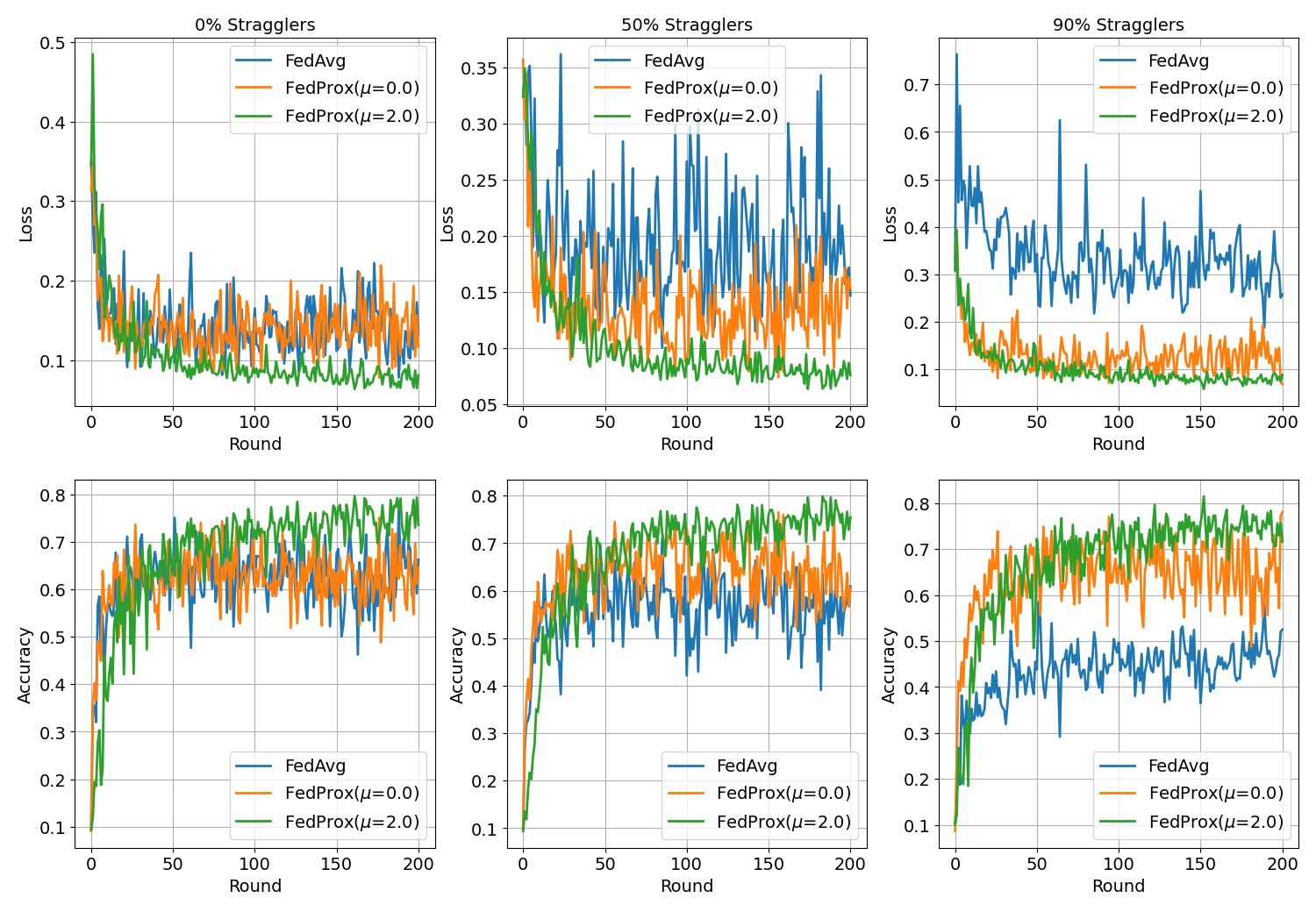 Abstract: Federated Learning is a distributed learning paradigm with two key challenges that differentiate it from traditional distributed optimization: (1) significant variability in terms of the systems characteristics on each device in the network (systems heterogeneity), and (2) non-identically distributed data across the network (statistical heterogeneity). In this work, we introduce a framework, FedProx, to tackle heterogeneity in federated networks. FedProx can be viewed as a generalization and re-parametrization of FedAvg, the current state-of-the-art method for federated learning. While this re-parameterization makes only minor modifications to the method itself, these modifications have important ramifications both in theory and in practice. Theoretically, we provide convergence guarantees for our framework when learning over data from non-identical distributions (statistical heterogeneity), and while adhering to device-level systems constraints by allowing each participating device to perform a variable amount of work (systems heterogeneity). Practically, we demonstrate that FedProx allows for more robust convergence than FedAvg across a suite of realistic federated datasets. In particular, in highly heterogeneous settings, FedProx demonstrates significantly more stable and accurate convergence behavior relative to FedAvg—improving absolute test accuracy by 22% on average.
