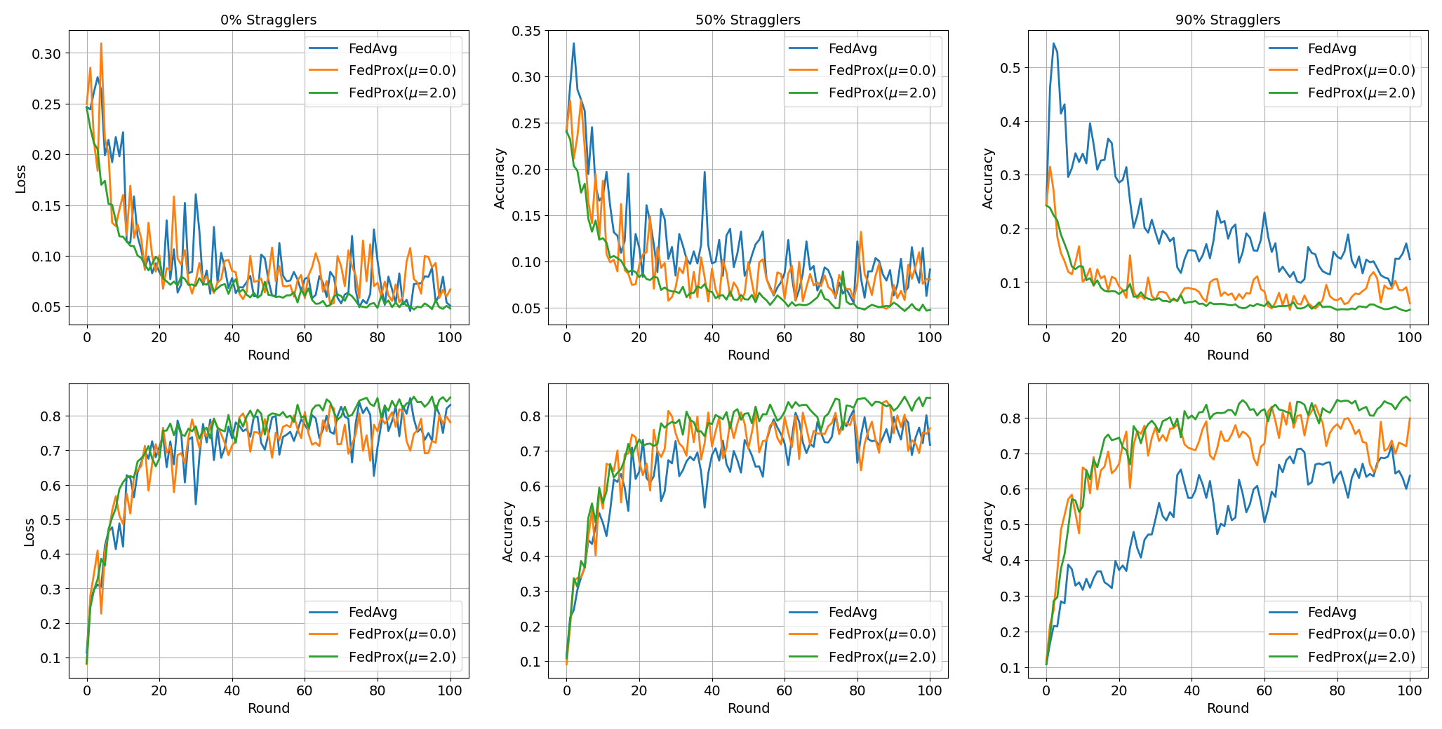 With the following command, we run both FedProx and FedAvg configurations while iterating through different values of mu and stragglers_fraction. We ran each experiment five times to ensure that the results are significant