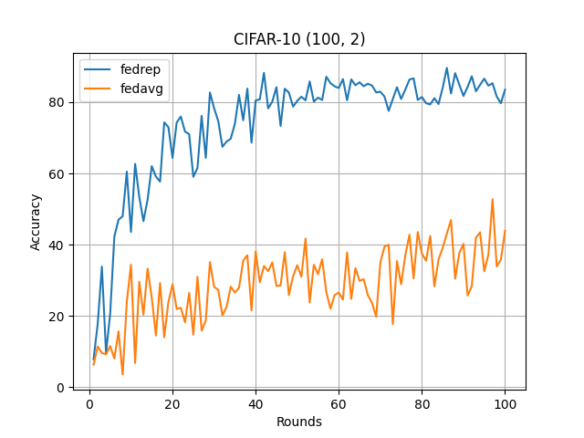 What’s implemented: The code in this directory replicates the experiments in Exploiting Shared Representations for Personalized Federated Learning (Liam Collins et al., 2021) for CIFAR10 and CIFAR-100 datasets, which proposed the FedRep model. Specifically, it replicates the results of CIFAR-10 ((100, 2), (100, 5)) and CIFAR-100 ((100, 5), (100, 20)) found in table 1 in their paper.
