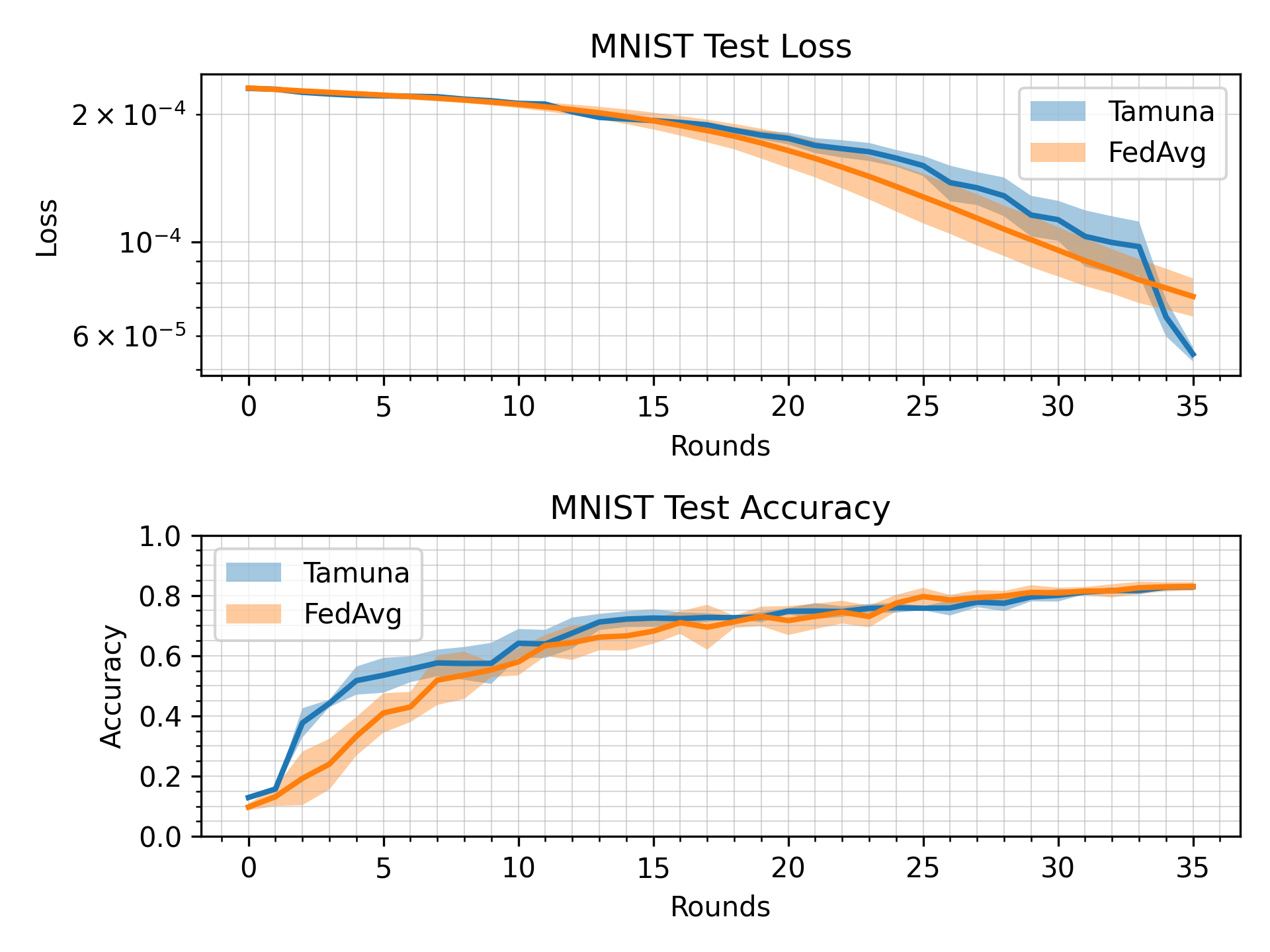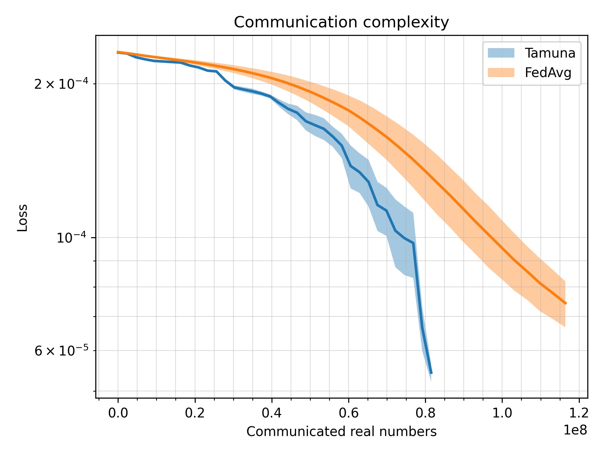 What’s implemented: The code in this directory compares Tamuna with FedAvg. It produces three plots comparing loss, accuracy and communication complexity of the two algorithms.
